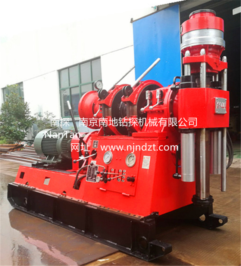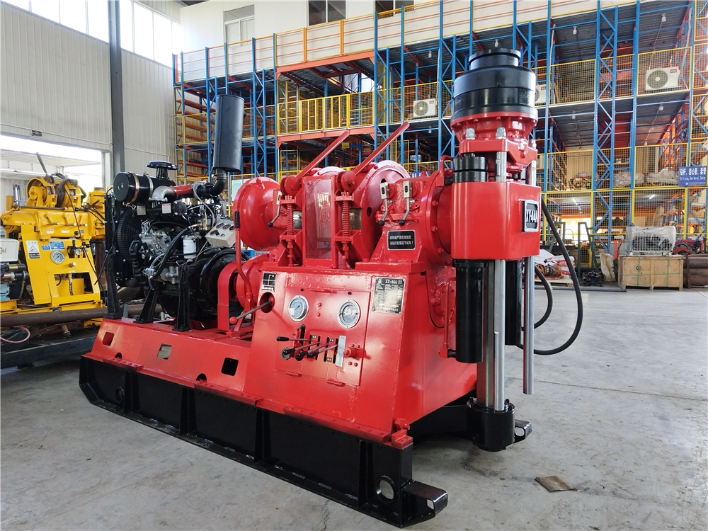 特点:具有较多的转速级数(8级)和合理的转速范围,低速扭矩大(最大达3200牛顿·米),既适合以合金、金刚石岩心钻进,也可用于工程地质勘察,水文水井钻进和基础桩工程施工。立轴通孔直径大(直径93毫米),双轴缸液压给进,行程较长(可达600毫米),工艺适应性强,特别适合大直径钻杆绳索取心(上部取心)钻进,有利于提高钻进效率和减少孔内事故。重量轻,可拆性好,钻机净重2300千克,主机可分解为10个部件(最大可拆部件重量300千克),搬迁方便,宜于山区工作。 液压卡盘采用双向供油并装有液压锁,卡盘夹持力大,夹持稳定。 配有水刹车,深孔钻进,下钻平稳安全。采用单联齿轮油泵供油,安装简单,方便使用,功率消耗少,液压系统油温低,工作稳定。系统中装有手摇油泵,当动力机不能工作时仍可用手摇油泵起出孔内钻具。 钻机结构紧凑,布局合理,所有部件表露在外,不相互重迭,便于维护、保养和修理。重心低,移车距离长(可达460毫米),固定牢靠,高速钻进稳定性好。 配有防震仪表,仪表寿命长,利于掌握孔内情况。操纵手把较少,操纵灵活可靠。通用化程度高,该机与XY-4型钻机通用件达60%,与XY-42型钻机通用件达75%。
