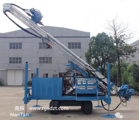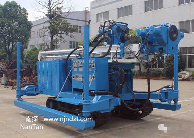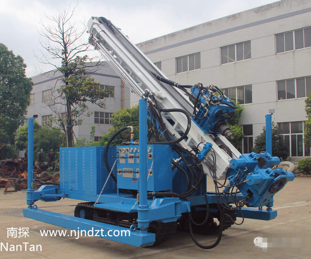 该钻机最大特点为动力头行程为5米,配备有大扭矩液压马达回转、油缸推进及提升能力大。配有液压伸缩随手吊车和液压卷扬机,减轻劳动强度。动力头具有多种速度,使得钻孔范围更宽。液压支腿行程大,不需吊车钻机即可转场装卸。