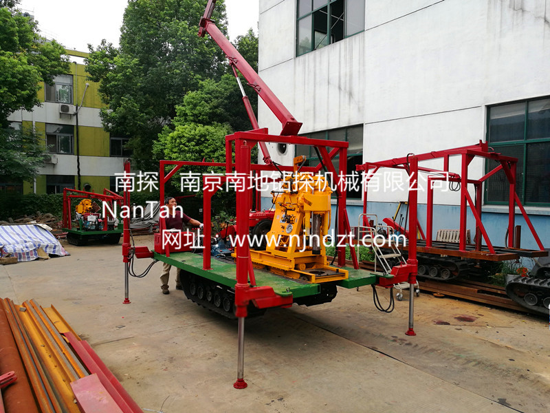 该履带底盘承载重量达4T,可以装载各种小型钻机,如:XY-1-1、XY-1、XY-1A、XY-1A(YJ)、XY-1A-4、XY-1A-5、XY-1B、XY-1B-1、XY-1B-2、XY-200、XY-200(YJ)、XY-200B、XY-200B-1、XY-200B-2、GXY-1系列、GXY-2Q、GXY-200B、GYQ-200、GYQ-200A、GK180、GXY-2K、GXY-2C等100-300米钻机,并可同时载BW160、BW160A、BW200或BW200A型泥浆泵,具有伸缩式液压起落钻塔、行走方便、上下汽车安全等特点,广泛适用于公路、铁路、水电、桥梁、坝基等的工程地质勘察、地质岩芯钻探、物理勘察、小型灌浆孔、爆破孔、水井孔和空调孔的钻进。