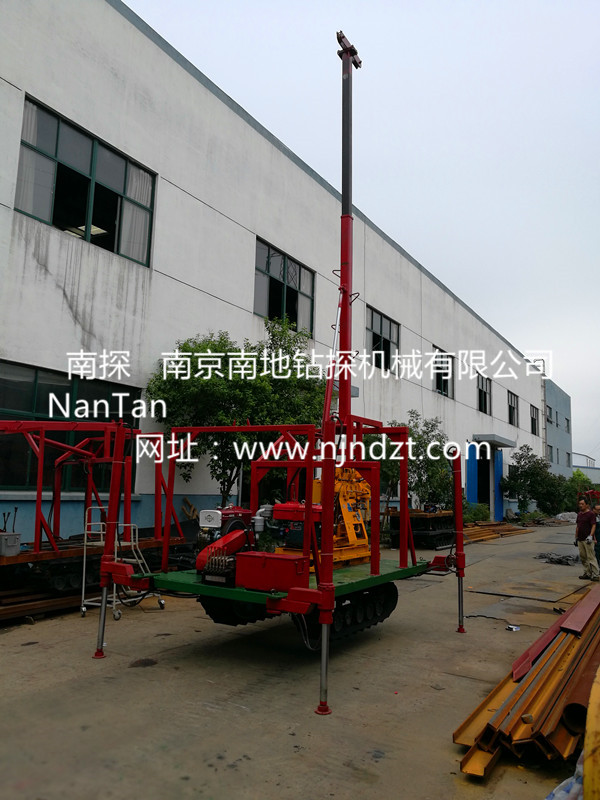 特点:自行行走、全液压起落钻塔(高度任意调节)、上下汽车,使整机搬迁方便,钻机更加适合在城市、野外和泥地等复杂场地施工。减轻劳动强度,节省人力、提高钻探效率。