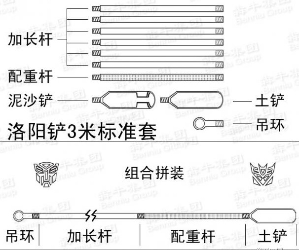 一段有柄,可以接长的白蜡杆。使用时垂直向下戳击地面,可深逾20米,利用半圆柱形的铲可以将地下