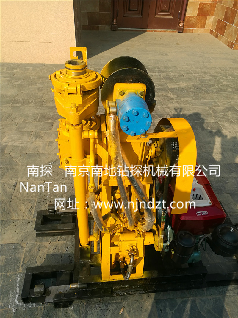 NTQZ-50B型钻机是一种具有油压给进的轻便钻机,配置移位底座、液压卷扬机、4.5米高三角架钻塔。额定钻孔深度50米,最大开孔直径允许为110mm,终孔直径为75mm,孔径46-200mm配套钻进深度根据地层情况而定。既可以旋转、 冲击钻进取土取芯样,也可以旋转钻进不取心钻孔,比如钻孔灌浆、引孔等。